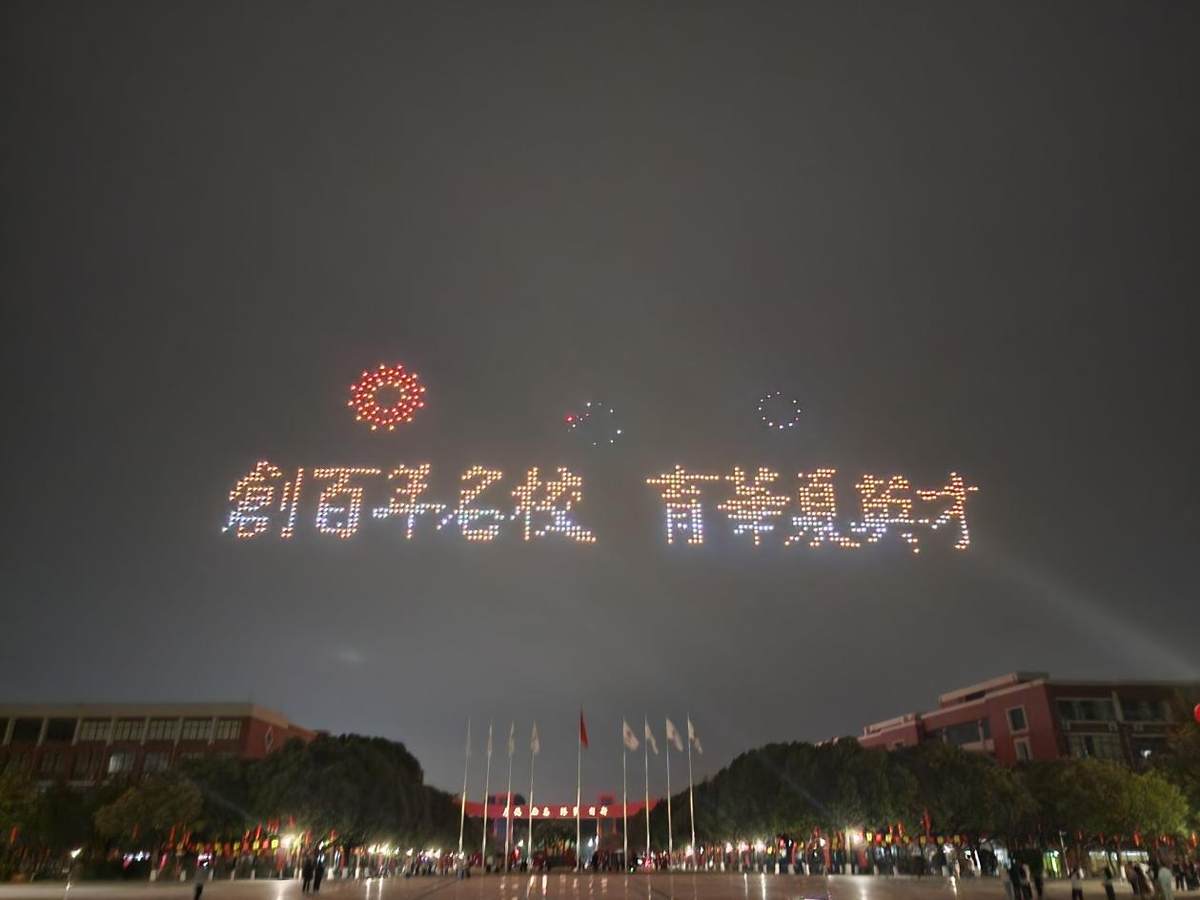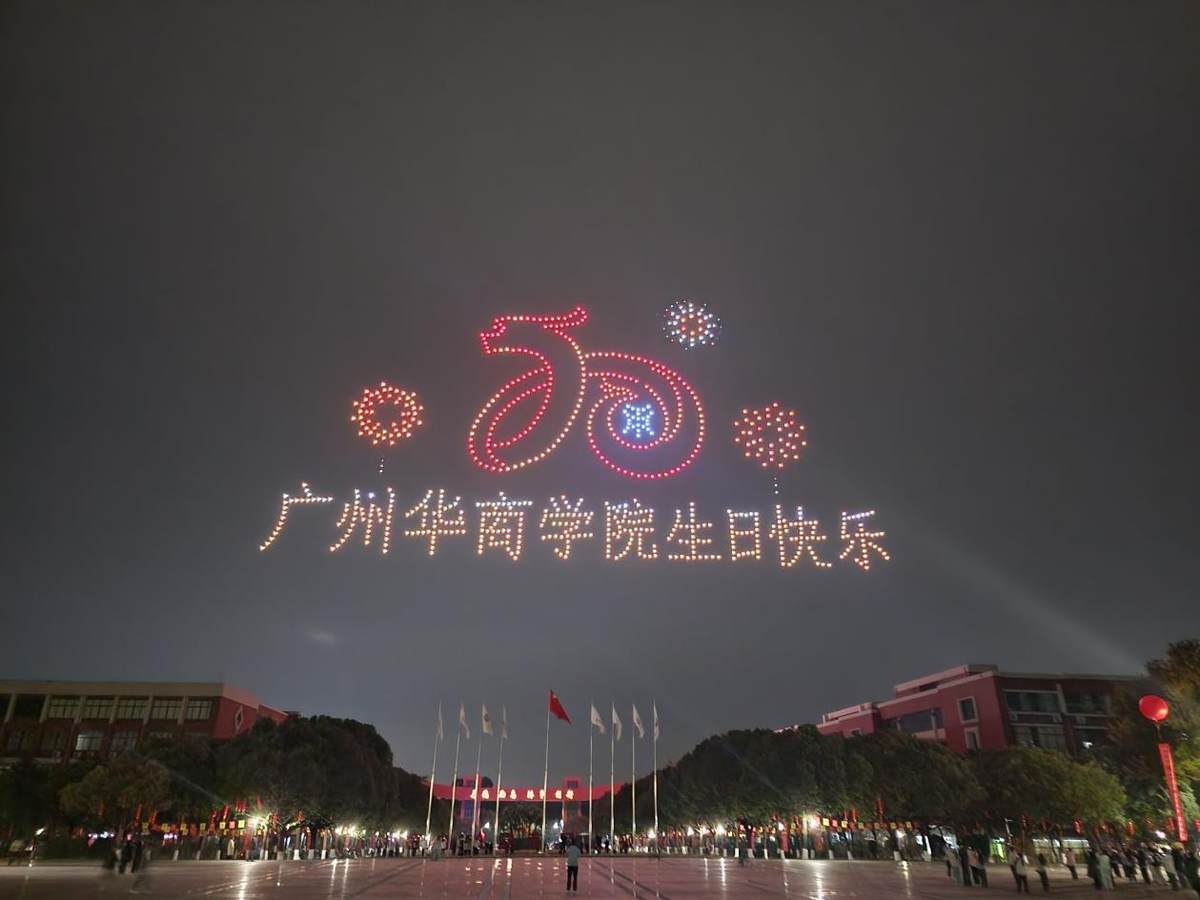 夜幕降临,在广州校区中央图书馆操场上19时,无人机表演惊艳亮相!1000架无人机在空中编队飞行,以《二十正青春 华商向未来》为主题,从创校之光、立校之魂、育人之基、奋进之路、攀登之梯、美育之果、拥抱之姿、笃行之力等字样与图案,灯光在夜空中勾勒出母校的发展轨迹与美好愿景,引得现场掌声雷动、尖叫不断,将活动氛围推向高潮。